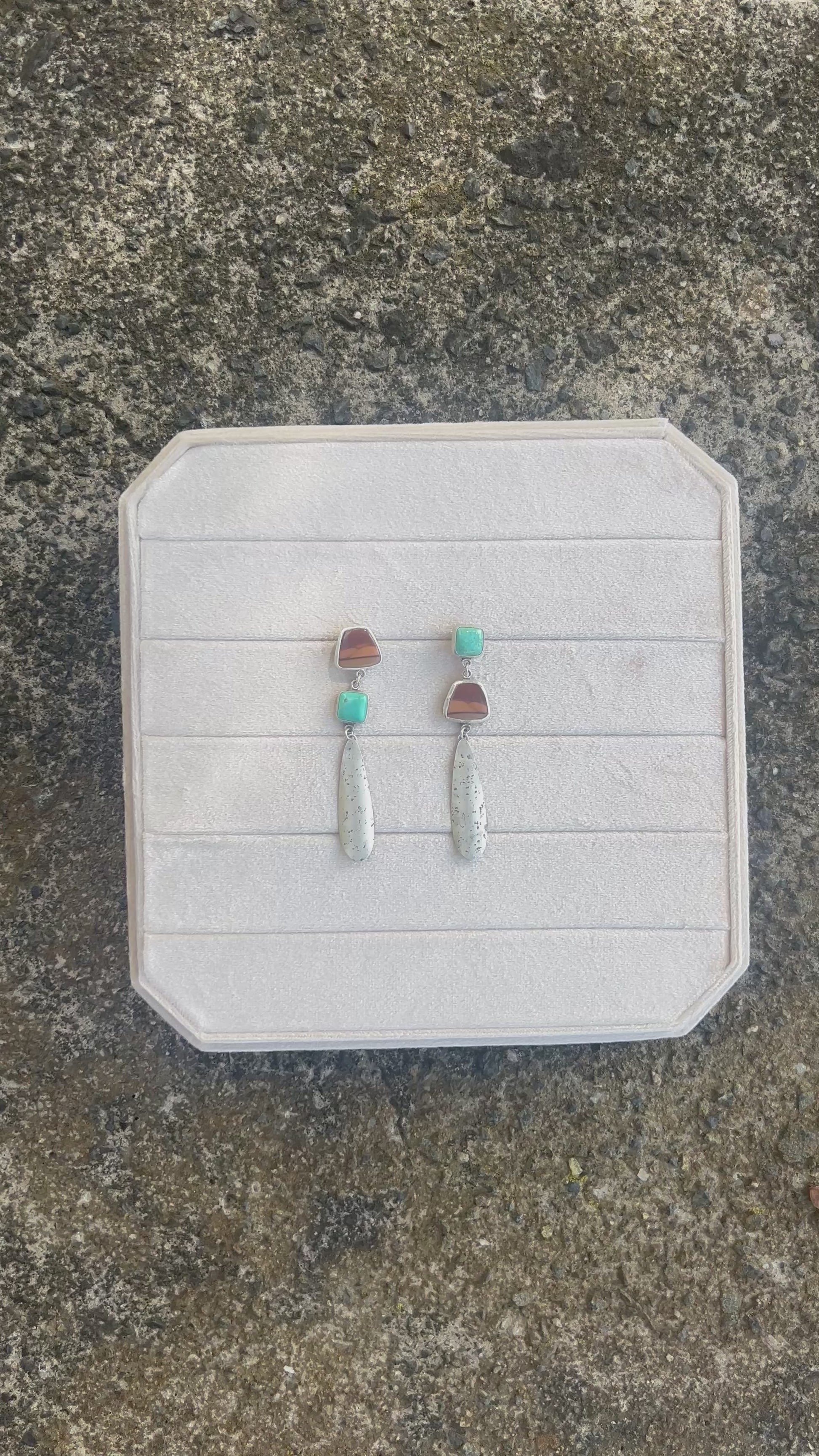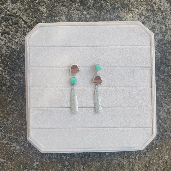Turquoise and Bruno jasper stones set in an asymmetrical style with concrete texture silver drops